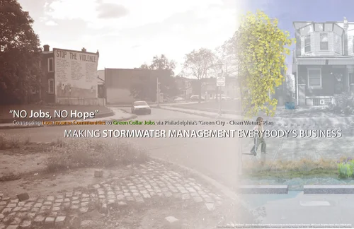 While walking through the streets of the Brown Street Transect in West Philadelphia, we met with local residents and asked for their impressions of the neighborhood. One of them expressed his concern at the high rate of unemployment in the neighborhood and in West Philadelphia. He said that without jobs, "You can't see no hope." He thought it would be helpful if government projects conducted in the neighborhood employed local residents. However, he said this was not often the case and shared a story illuminating that when the L-Train was being constructed in the neighborhood, almost no people from the neighborhood were hired to do any of the work. He suggested that the way to improve the condition of the neighborhood and to secure resident buy-in and adoption of green infrastructure was to link people in the neighborhood to the jobs created by the green infrastructure implementation in their neighborhood. Unfortunately, Philadelphia's "Green City-Clean Water" plan currently lacks a strategy for connecting the low income communities to the green collar jobs created in their neighborhoods through the implementation of green infrastructure measures. This proposal for the Brown Street Transect suggests a way.